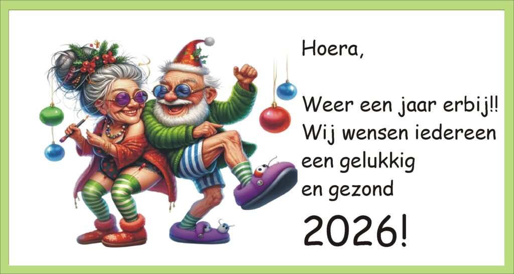 Januari 2026 Hallo Lieve mensen Weer een jaar voorbij. Mijn jaar is begonnen met een overlijden in onze kennissen kring op tweede kerstdag. Hoe slecht kan een nieuw jaar beginnen. Daarom geniet zoveel je kunt samen met je familie, vrienden, kennissen en al die je dierbaar zijn, want je weet niet wat de dag van morgen je brengen zal. Daarom aan iedereen die we kennen en ook degenen die we niet kennen, de beste wensen voor 2026 en dat alles wat je hoopt en dat waar je op hoopt, mag uitkomen in een goede gezondheid. Ik hoop jullie in het nieuwe jaar weer allemaal te mogen begroeten. Daarom . . . . . . . . . . Lieve groetjes en tot ziens. Geert. |